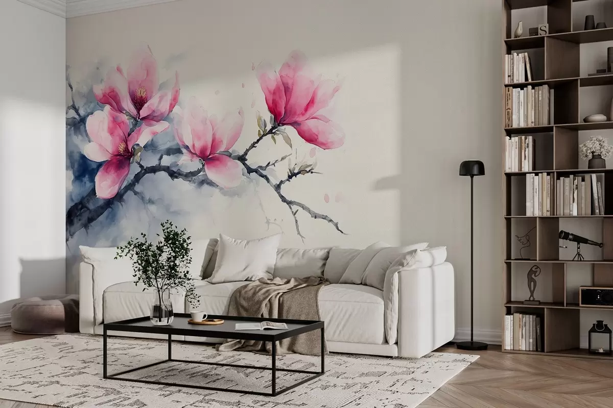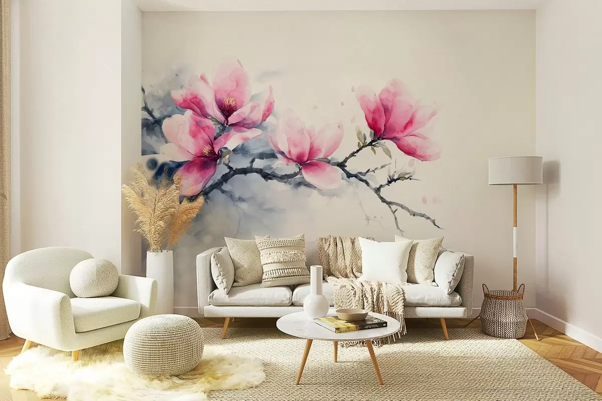 Τοιχογραφίες ανθισμένο κλαδί ροζ μανόλιας σε ελεφαντόδοντο φόντο Nr. w04027