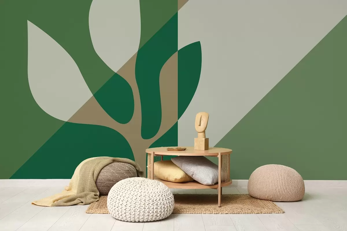 Τοιχογραφίες αφηρημένο γραφικό φυτό στο φόντο της γεωμετρίας σε πράσινο και ώχρα χρώματα Nr. w04028