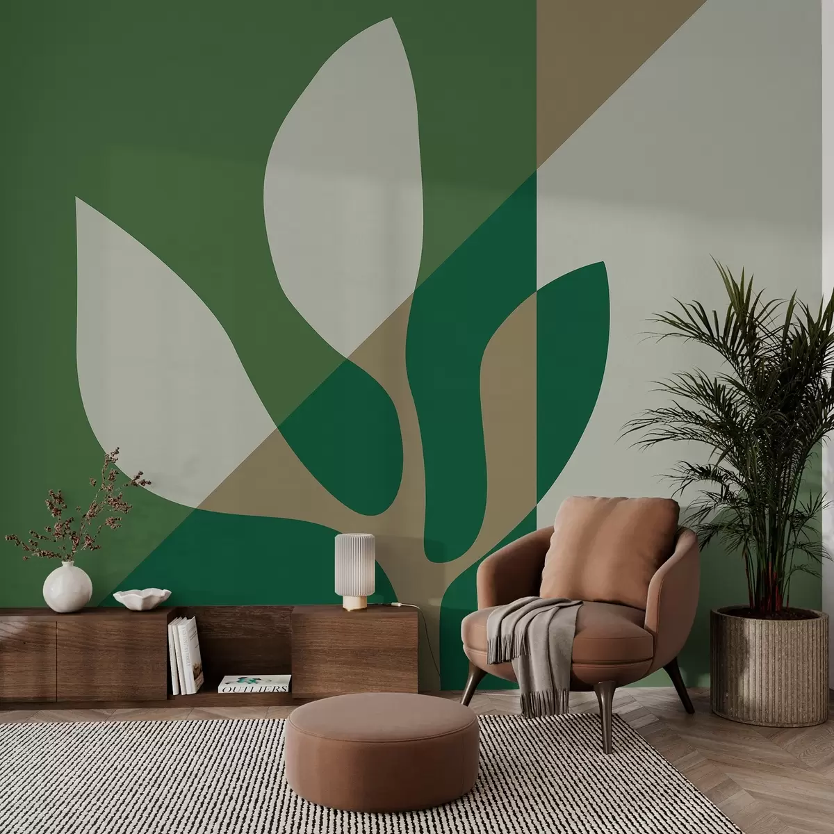 Τοιχογραφίες αφηρημένο γραφικό φυτό στο φόντο της γεωμετρίας σε πράσινο και ώχρα χρώματα Nr. w04028