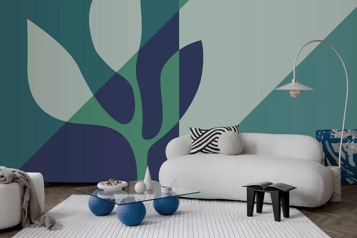 Τοιχογραφίες αφηρημένο γραφικό φυτό σε φόντο γεωμετρίας σε μπλε τόνους Nr. w04028v1