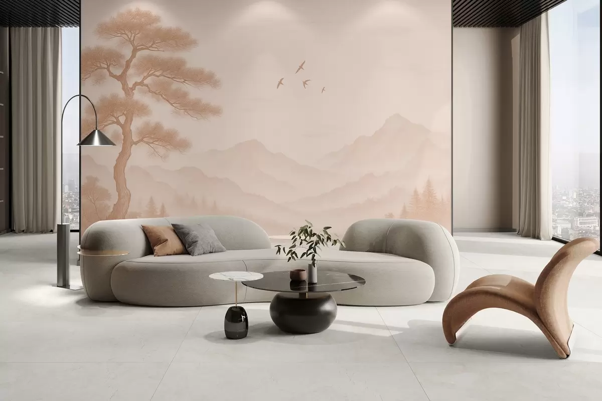 Τοιχογραφίες πανόραμα λόφων με ένα μεγάλο δέντρο σε αποχρώσεις μόκα Nr. w04033v1