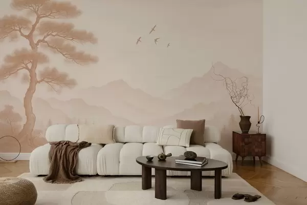 Τοιχογραφίες πανόραμα λόφων με ένα μεγάλο δέντρο σε αποχρώσεις μόκα Nr. w04033v1