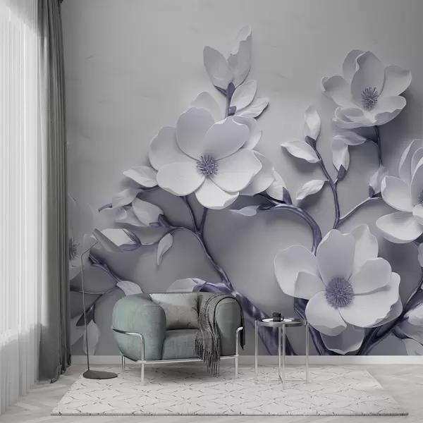 Τοιχογραφίες Διαστατικό φλοράλ σχέδιο σε απαλές λευκές και βιολετί-γκρι αποχρώσεις Nr. w04039v1