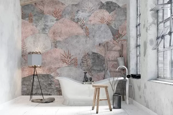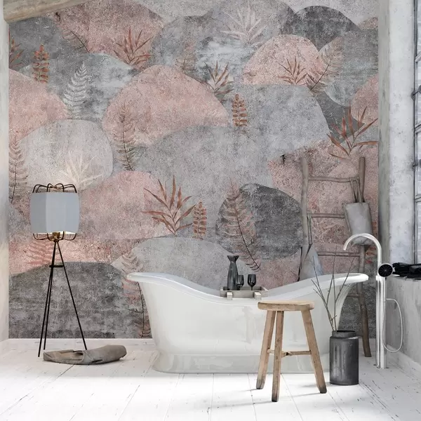 Τοιχογραφίες Πέτρες με φυτά, φτέρη, σκανδιναβικό, ρουστίκ στυλ, γκρι και ροζ χρώματα Nr. w04064v1