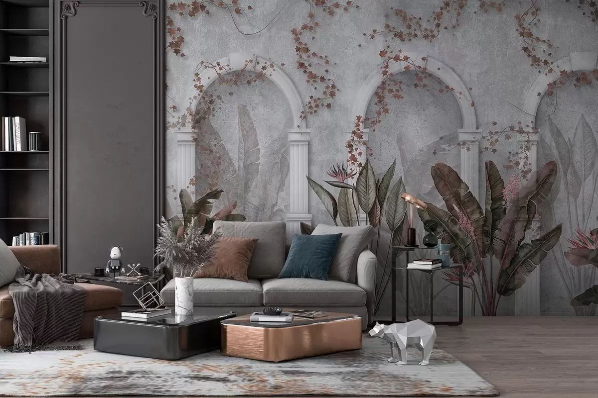 Τοιχογραφίες Τείχος από σκυρόδεμα με καμάρες και τροπικά φυτά, λουλουδάτα, μπορντό χρώματα Nr. w04065v1
