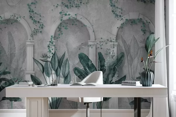 Τοιχογραφίες Τείχος από σκυρόδεμα με καμάρες και τροπικά φυτά, λουλουδάτα, μπλε χρώματα Nr. w04065v2