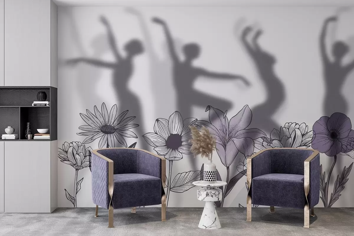 Τοιχογραφίες Σιλουέτες μπαλαρίνων, ρουστίκ λουλούδια, line art, γκρι και μοβ χρώματα Nr. w04069v2