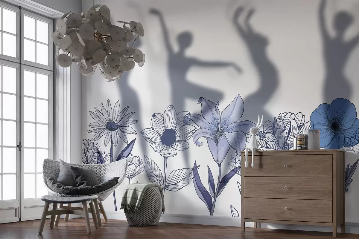 Τοιχογραφίες Μπαλαρίνες σιλουέτες, ρουστίκ λουλούδια, line art, μπλε χρώματα Nr. w04069v3