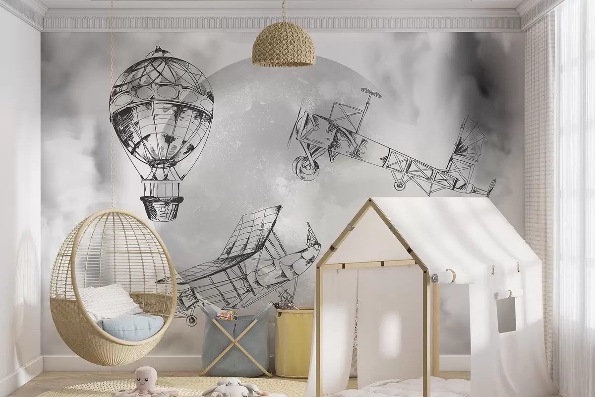 Τοιχογραφίες Ρετρό αεροπλάνα με φόντο το φεγγάρι και τα σύννεφα Nr. w04085