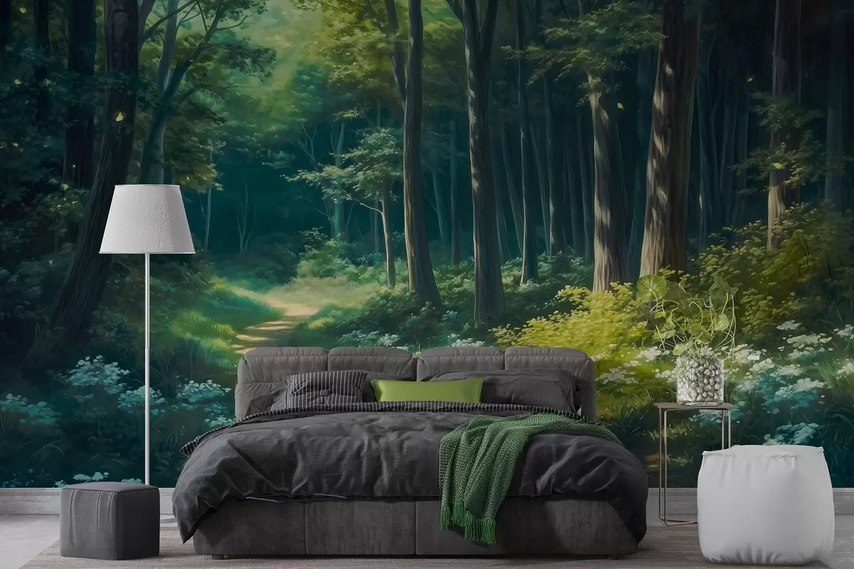 Τοιχογραφίες Πράσινο δάσος με απαλό ηλιακό φως, δέντρα και λευκά λουλούδια, σχέδιο σε στυλ λαδιού Nr. w04118