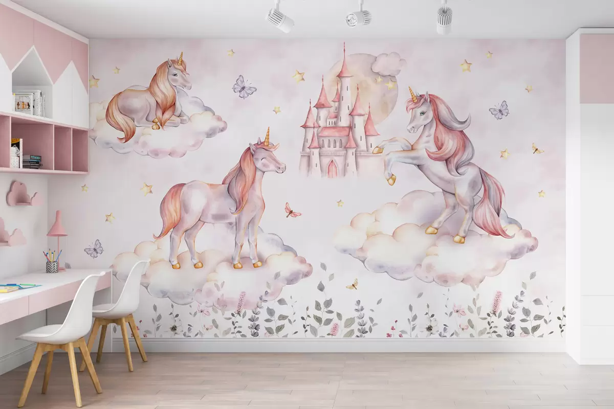 Τοιχογραφίες Μονόκεροι στα σύννεφα με αστέρια, πεταλούδες και λουλούδια Nr. w04165