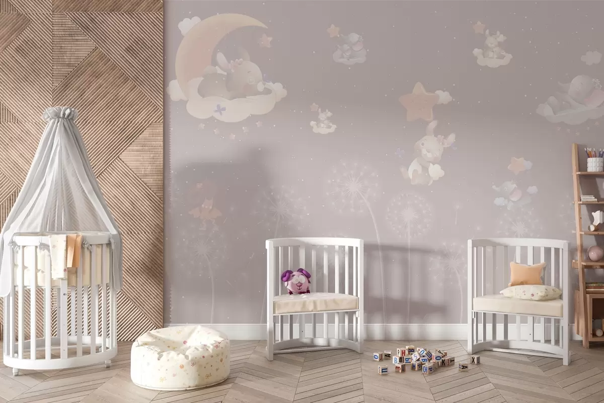 Τοιχογραφίες Παραμυθένια νύχτα με κουνέλι και πικραλίδες σε ροζ φόντο Nr. w04195v2