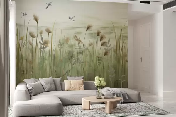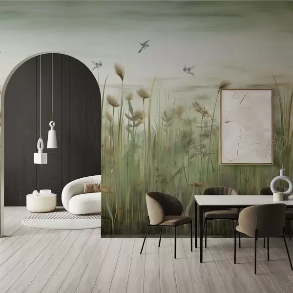 Τοιχογραφίες Χορτάρι τοπίο με χελιδόνια ενάντια σε απαλό ουρανό Nr. w04258v1