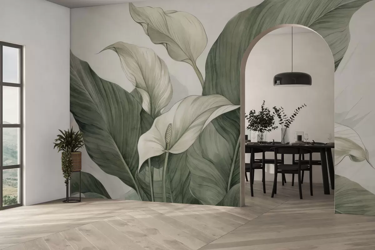 Τοιχογραφίες Κοντινό πλάνο ανθισμένου spathiphyllum με μεγάλα φύλλα Nr. w04263