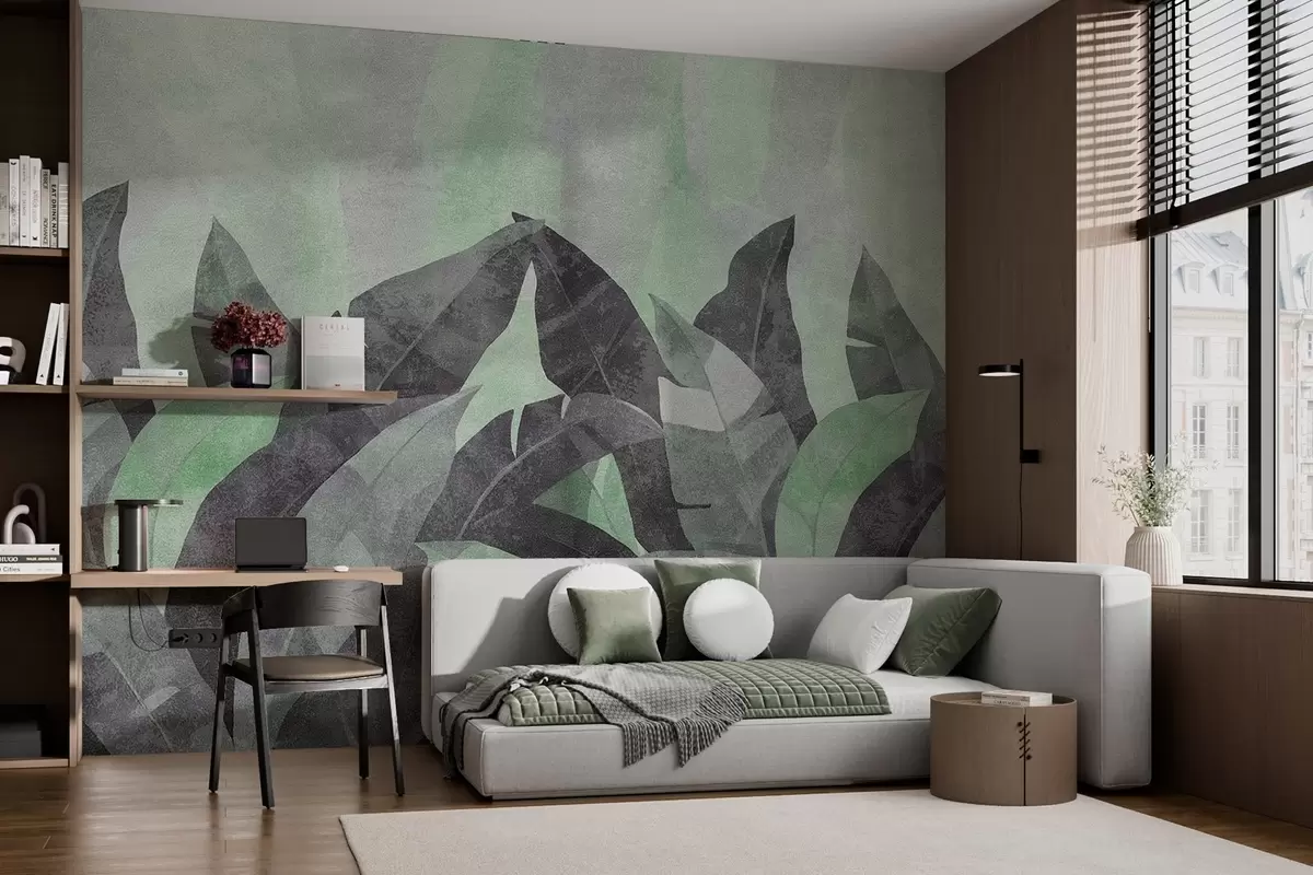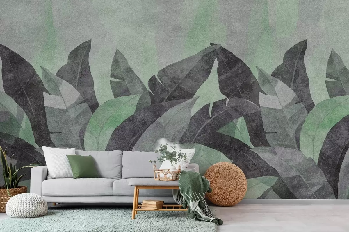 Τοιχογραφίες φύλλα μπανάνας με υφή σε αποχρώσεις του πράσινου και του γκρι Nr. w04285v1