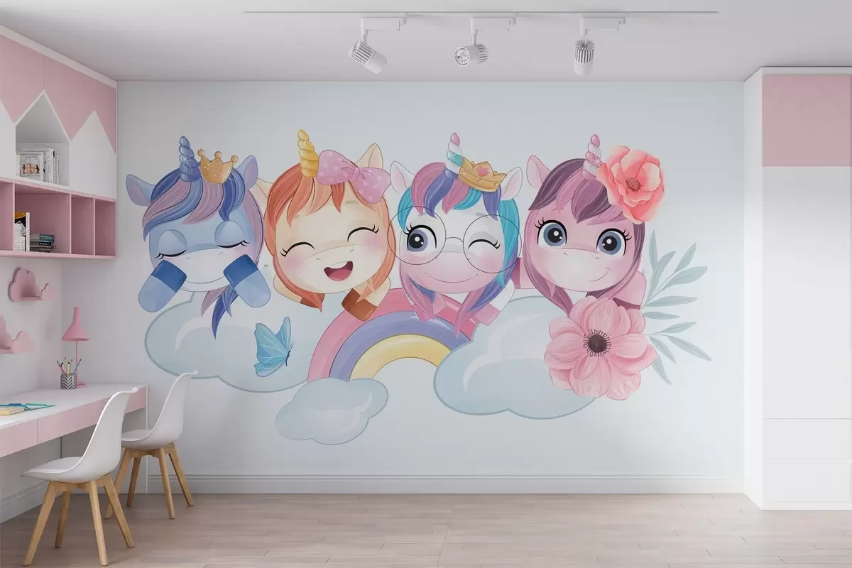 Τοιχογραφίες Χαριτωμένοι μονόκεροι ανάμεσα σε σύννεφα και ουράνια τόξα Nr. w04298