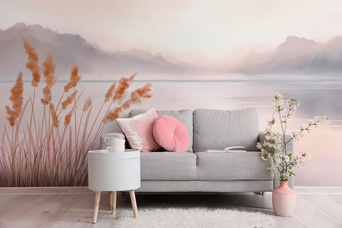 Τοιχογραφίες μια γραφική λίμνη με καλαμιές και βουνά Nr. w04315