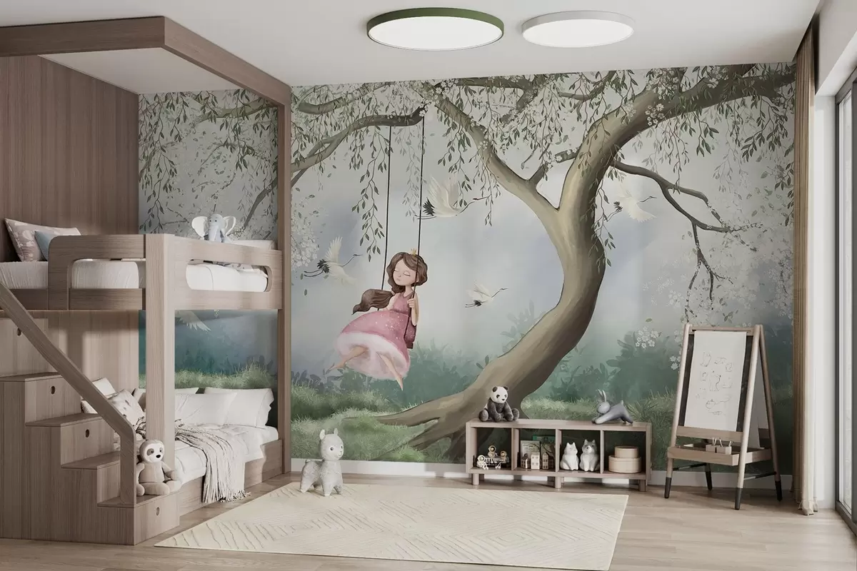 Τοιχογραφίες Κορίτσι σε κούνια κάτω από ανθισμένο δέντρο με πουλιά που πετούν γύρω του Nr. w04370