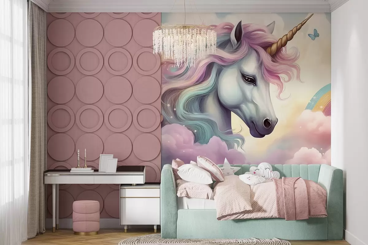 Τοιχογραφίες Μονόκερος σε συννεφιασμένο ουρανό με ουράνιο τόξο Nr. w04372