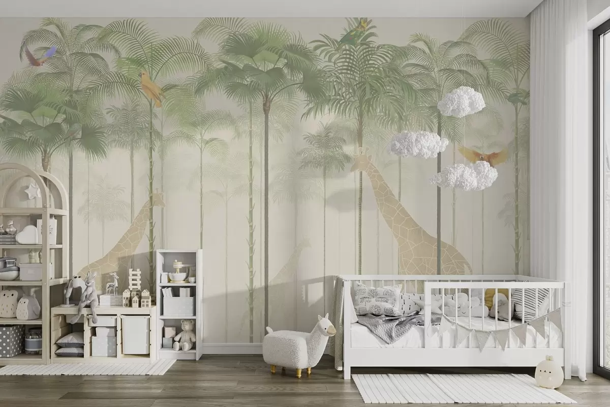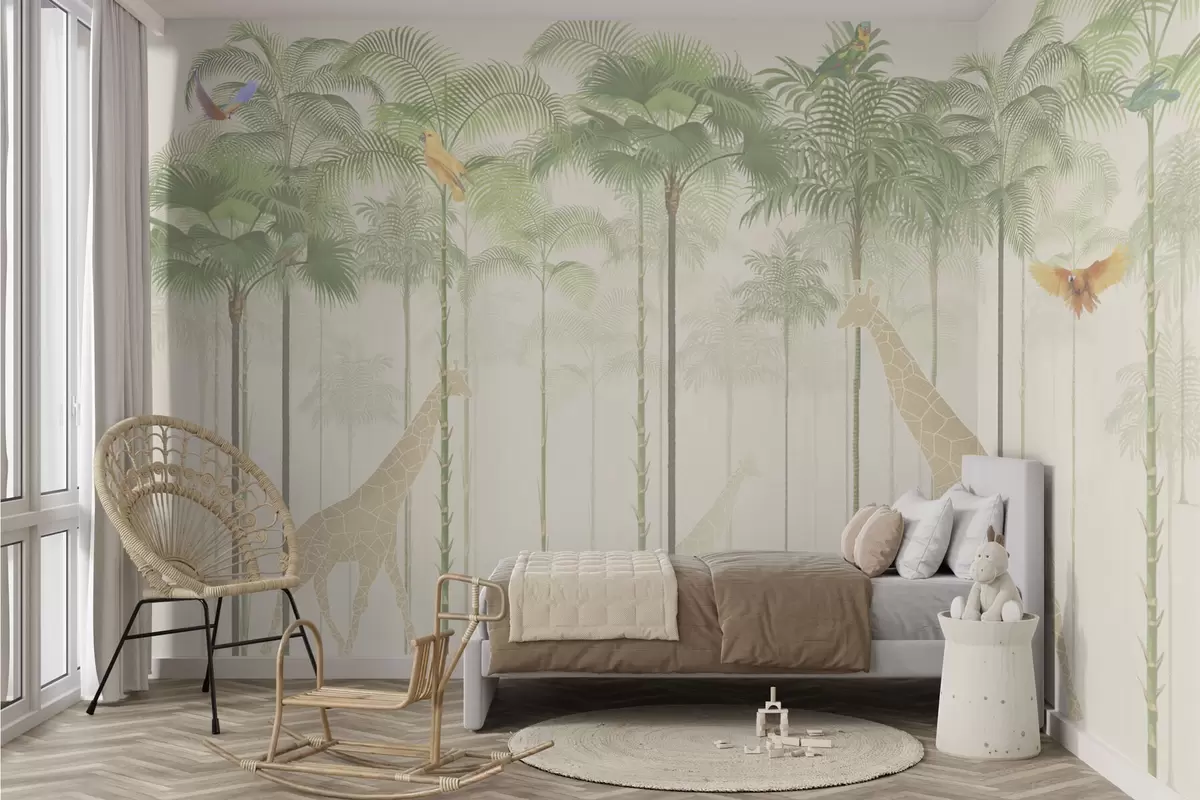 Τοιχογραφίες Καμηλοπαρδάλεις και τροπικά πουλιά ανάμεσα σε ψηλούς φοίνικες Nr. w04400