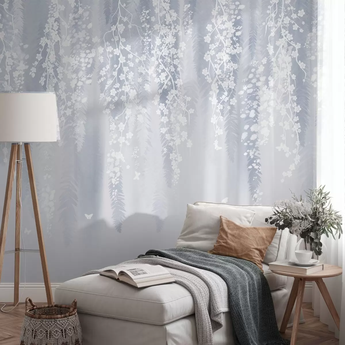 Τοιχογραφίες Δροσερή μπλε εκδοχή κλαδιών με λευκά λουλούδια Nr. w04417v2