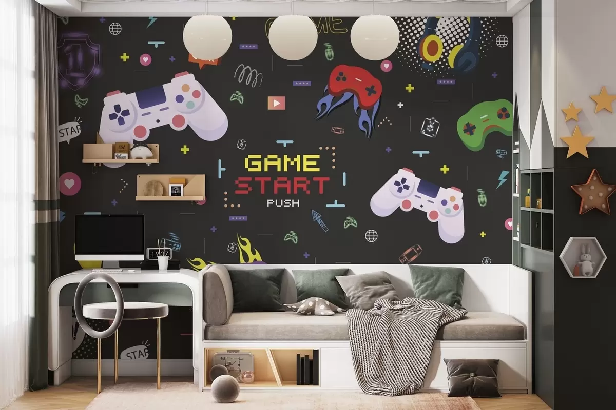 Τοιχογραφίες Φωτεινό μοτίβο για gamers με κονσόλες και κείμενο σε μορφή pixel Nr. w04581