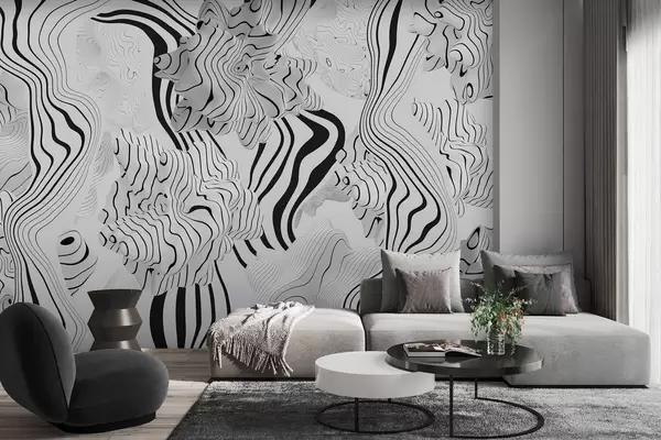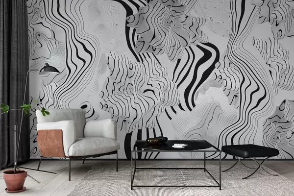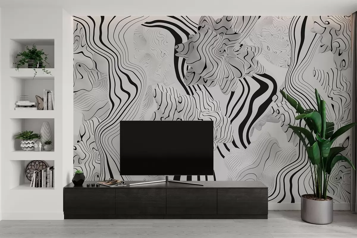 Τοιχογραφίες αφηρημένα οργανικά σχήματα σε 3D στυλ σε λευκούς και γκρι τόνους με μαύρες ρίγες Nr. w04627