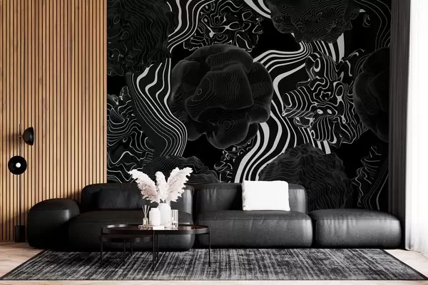 Τοιχογραφίες αφηρημένα οργανικά σχήματα σε 3D στυλ σε μαύρους τόνους με λευκές ρίγες Nr. w04628