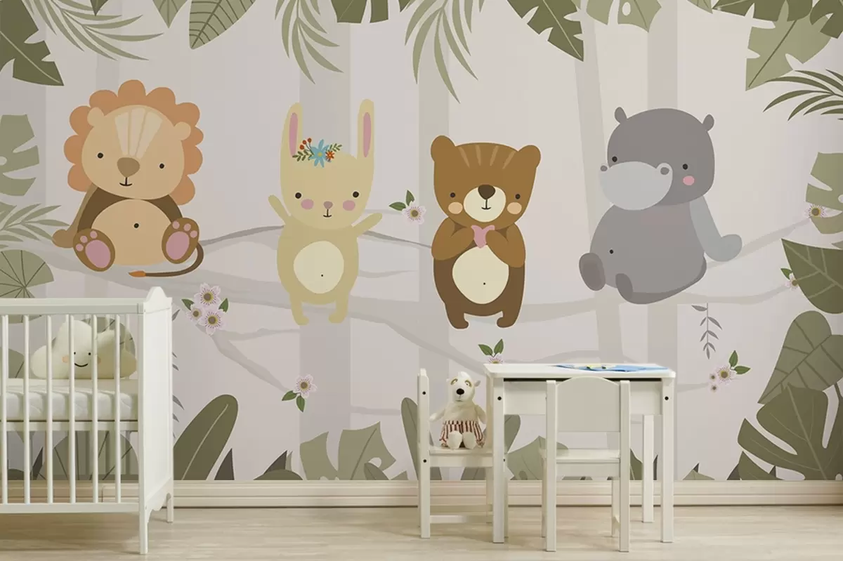 Τοιχογραφίες Χαριτωμένο λιοντάρι, λαγουδάκι, αρκουδάκι και ιπποπόταμος ανάμεσα στα φύλλα Nr. w04682