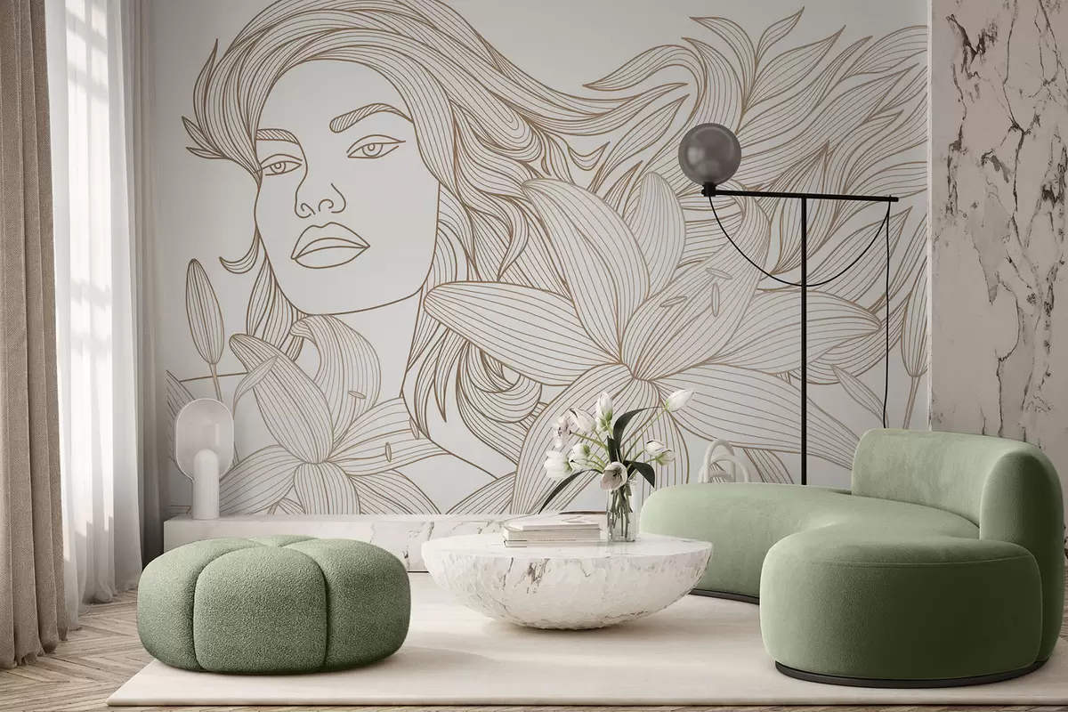 Τοιχογραφίες Πορτρέτο κοριτσιού σε αποχρώσεις του μπεζ με λουλούδια κρίνα Nr. w04689v1
