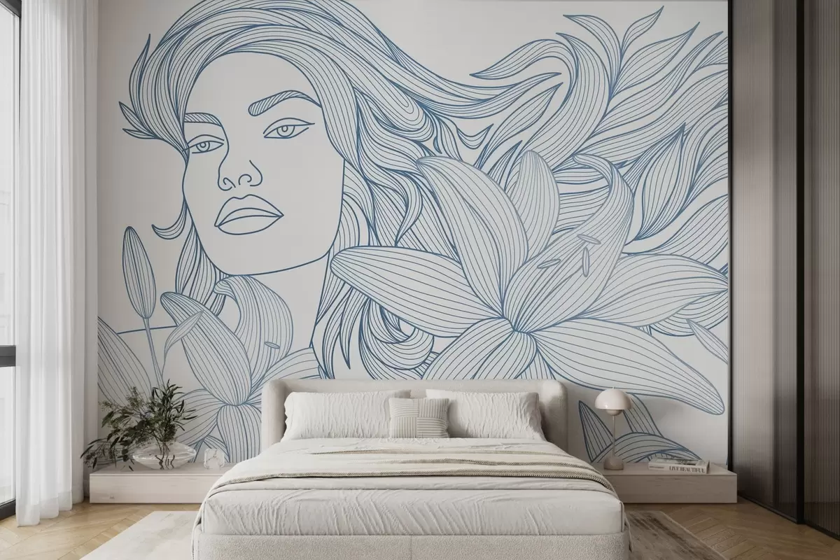 Τοιχογραφίες Πορτρέτο κοριτσιού σε αποχρώσεις του μπλε με κρίνα Nr. w04689v2