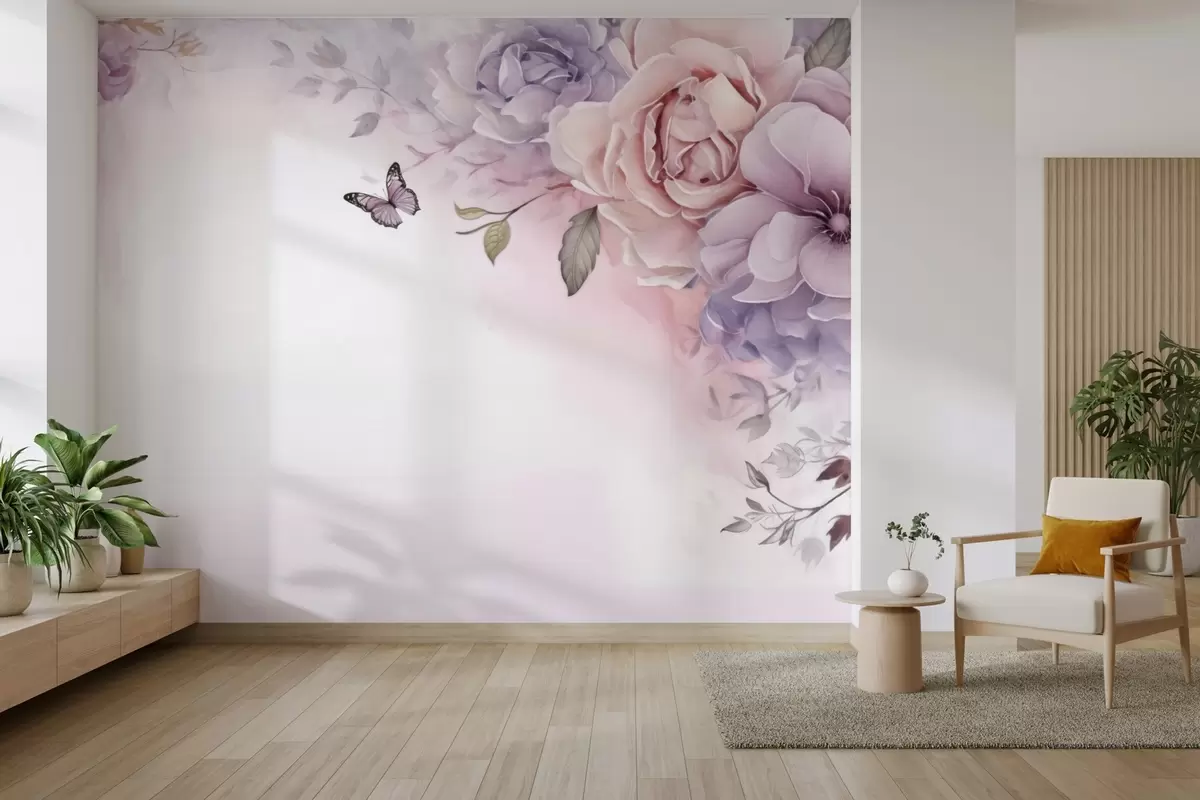 Τοιχογραφίες Λεπτά ροζ και λιλά λουλούδια με πεταλούδα Nr. w04711
