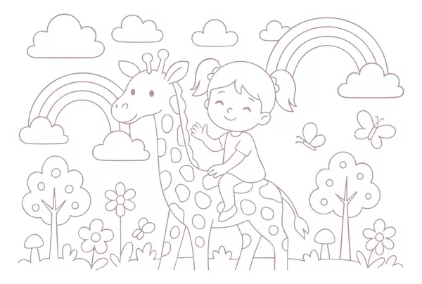 Τοιχογραφίες ασπρόμαυρη ζωγραφιά ενός κοριτσιού πάνω σε μια καμηλοπάρδαλη, στο στυλ ενός παιδικού βιβλίου ζωγραφικής Nr. w04753