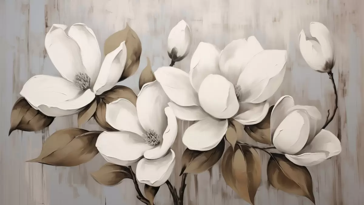 Τοιχογραφίες Μεγάλα άνθη μανόλιας με γκρι-καφέ φύλλα σε φόντο με βουρτσισμένη υφή Nr. w04785
