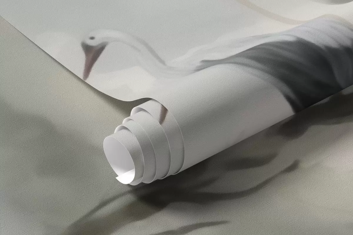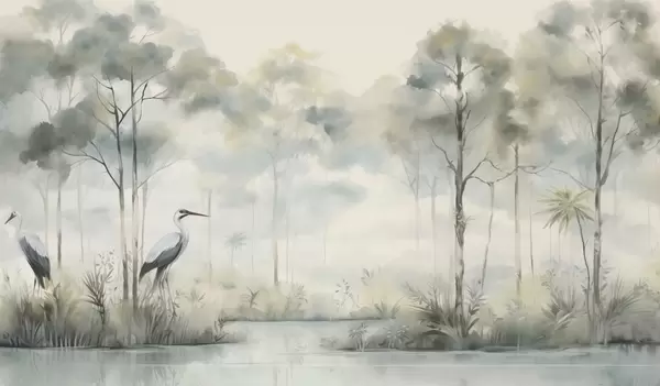 Τοιχογραφίες Ομιχλώδες δάσος δίπλα στο νερό με ερωδιούς, απαλή δροσερή παλέτα Nr. w04788