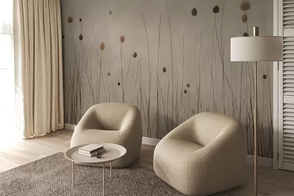 Τοιχογραφίες Λεπτά χόρτα και αφράτα σπόρια σε ζεστό μπεζ φόντο Nr. w04793