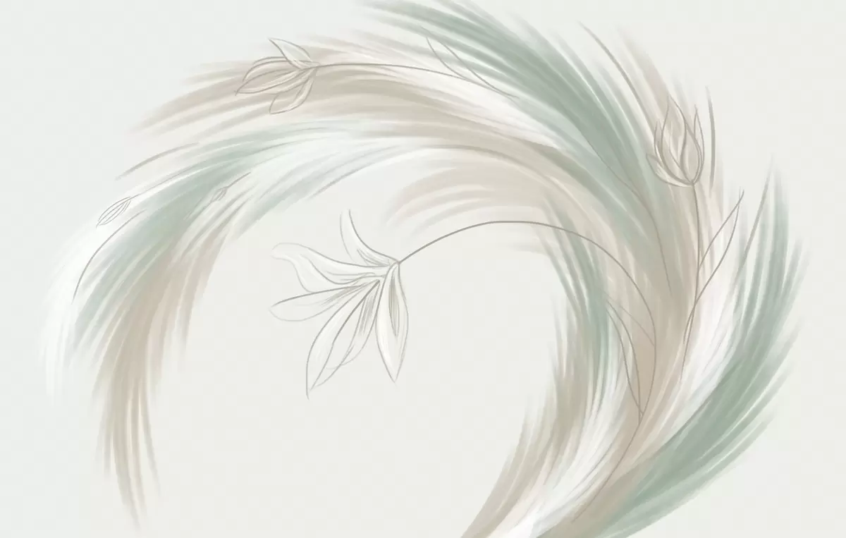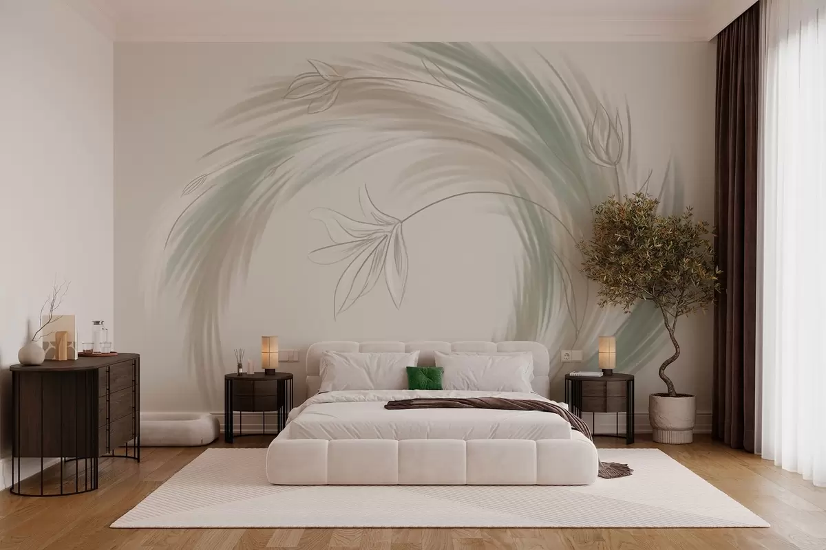 Τοιχογραφίες πράσινα και μπεζ φτερά και λουλούδια, ζωγραφισμένα στο χέρι Nr. w04816