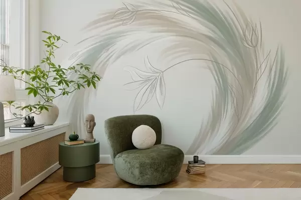 Τοιχογραφίες πράσινα και μπεζ φτερά και λουλούδια, ζωγραφισμένα στο χέρι Nr. w04816