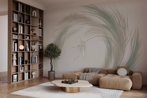 Τοιχογραφίες πράσινα και μπεζ φτερά και λουλούδια, ζωγραφισμένα στο χέρι Nr. w04816