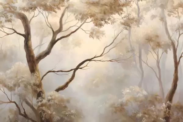 Τοιχογραφίες Το δάσος μέσα στην ελαφριά πρωινή ομίχλη. Μια λεπτή ατμοσφαιρική ζωγραφική στο στυλ ενός καλλιτεχνικού τοπίου. Nr. w04817