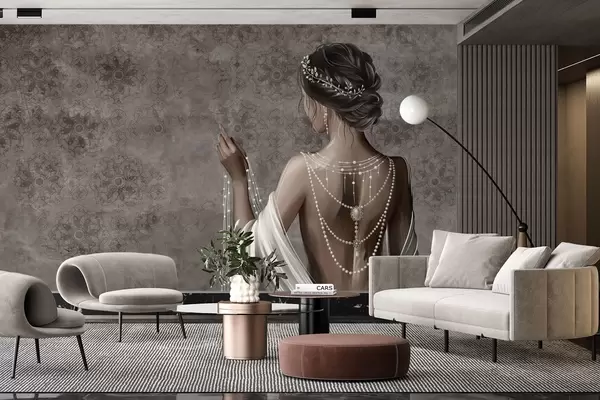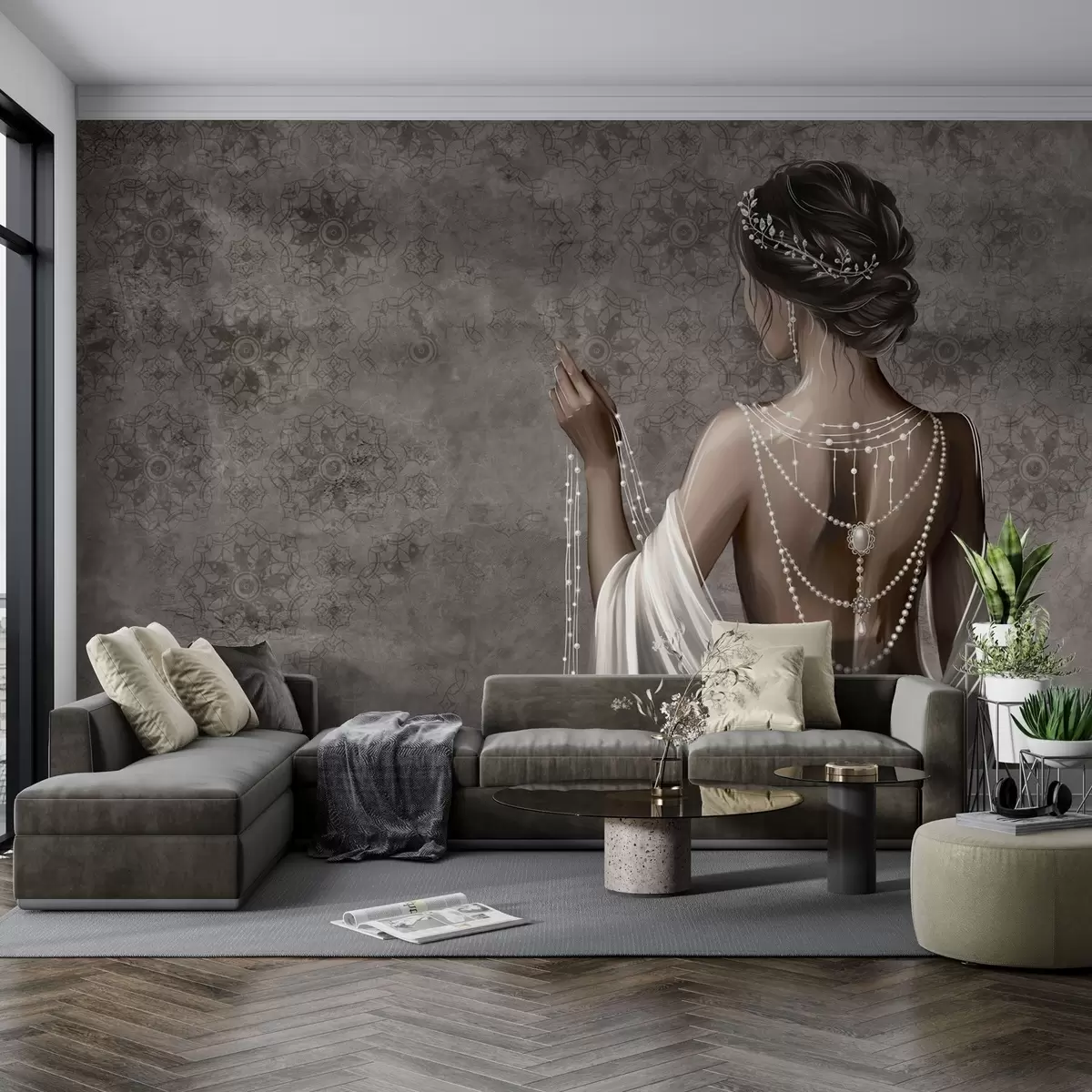 Τοιχογραφίες Γυναίκα από πίσω με μαργαριτάρια, φόντο με μοτίβο γκρι πέτρας Nr. w04854