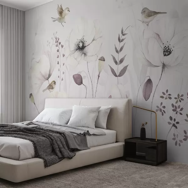 Τοιχογραφίες Ακουαρέλα με παπαρούνες και μικρά πουλιά σε απαλό μωβ χρώμα Nr. w04861
