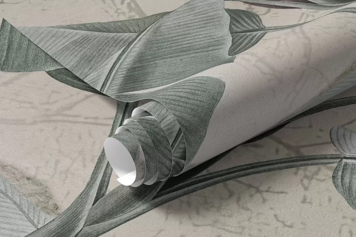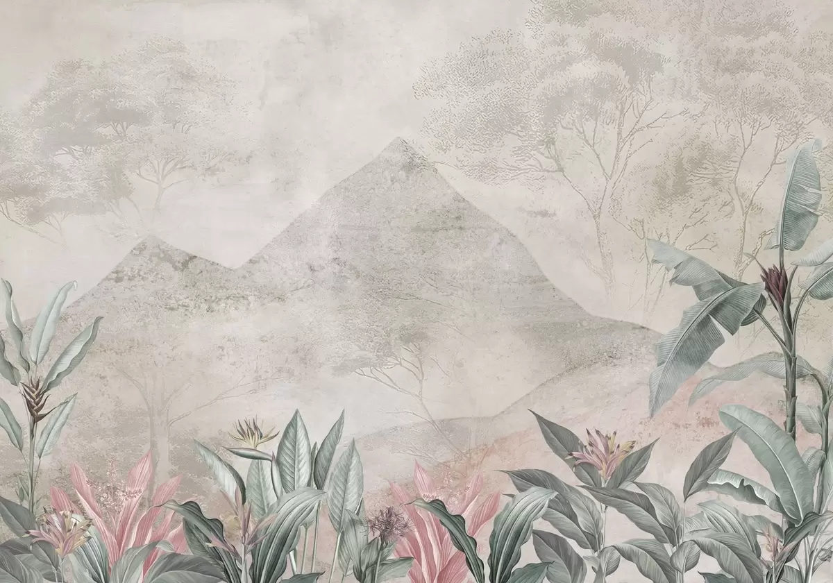Τοιχογραφίες Παστέλ φύλλα μπανανιάς και τροπικά λουλούδια με φόντο τα βουνά Nr. w04933
