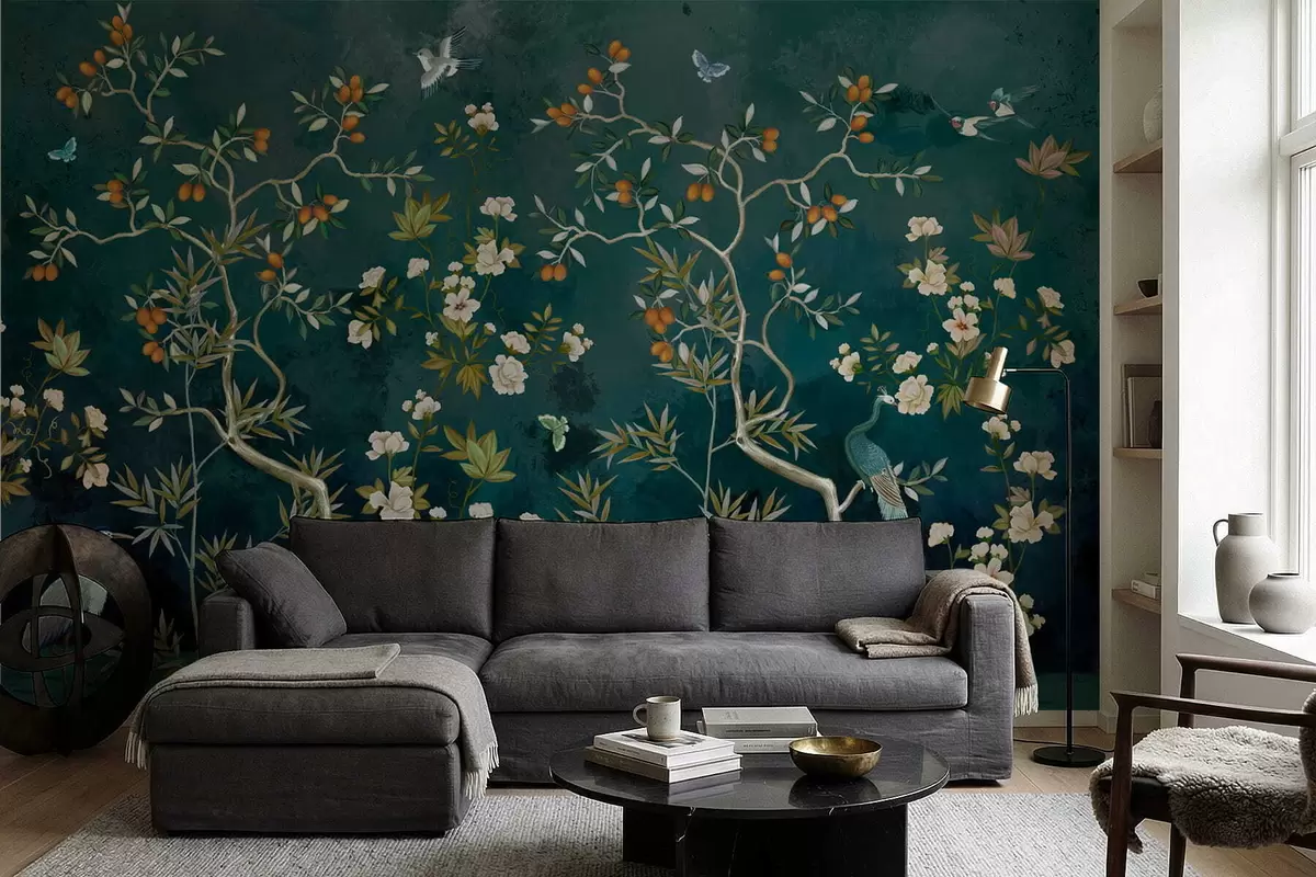 Τοιχογραφίες Διακοσμητική σκηνή με δέντρα, λουλούδια και πουλιά σε σκούρο φόντο Nr. w05004