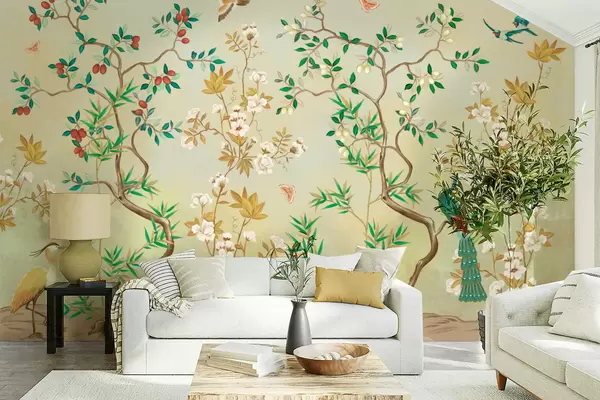 Τοιχογραφίες Σκηνή με δέντρα, λουλούδια και πουλιά, ανοιχτόχρωμο φόντο Nr. w05004v1