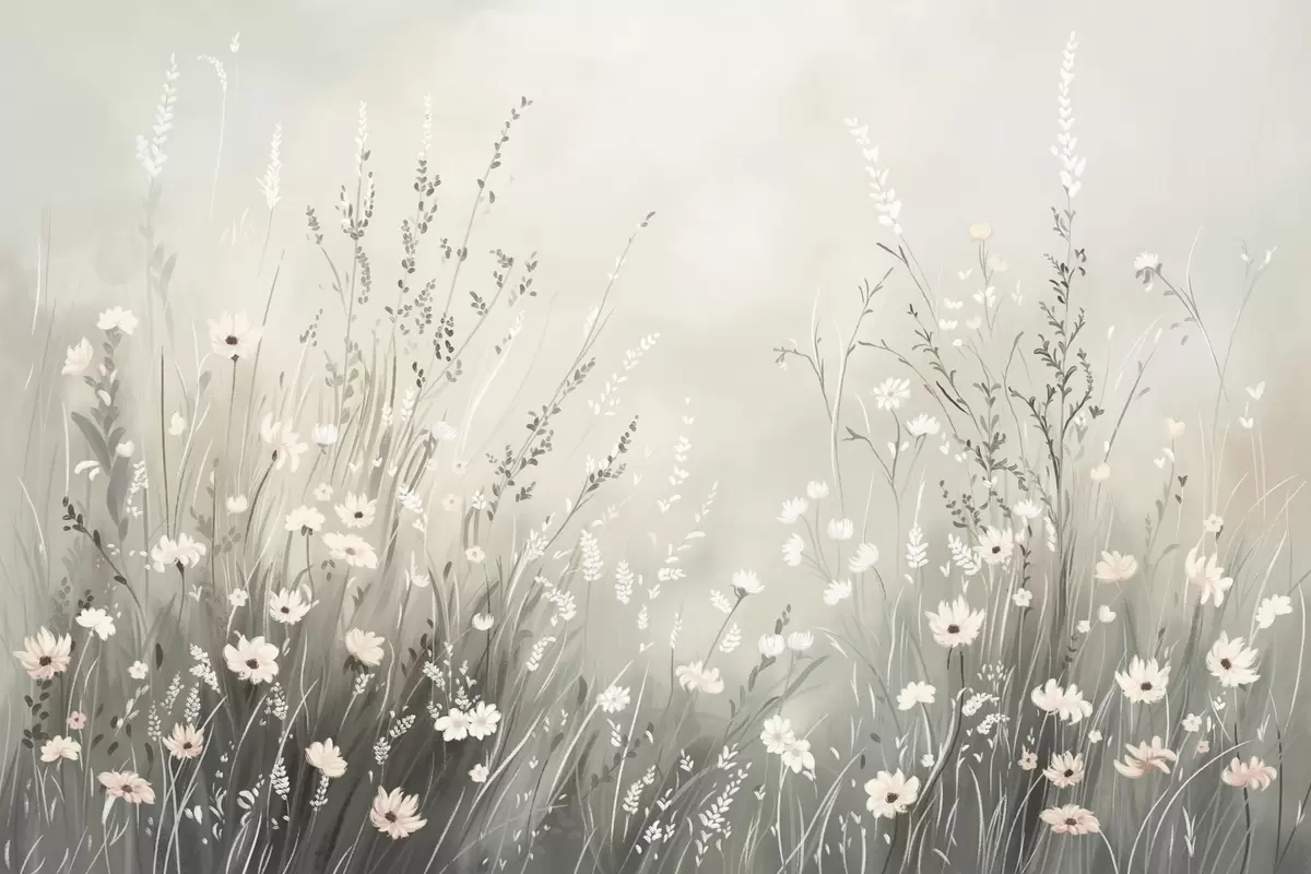 Τοιχογραφίες Απαλή λιβαδική σκηνή με λευκά λουλούδια και λεπτεπίλεπτα χόρτα Nr. w05015v1
