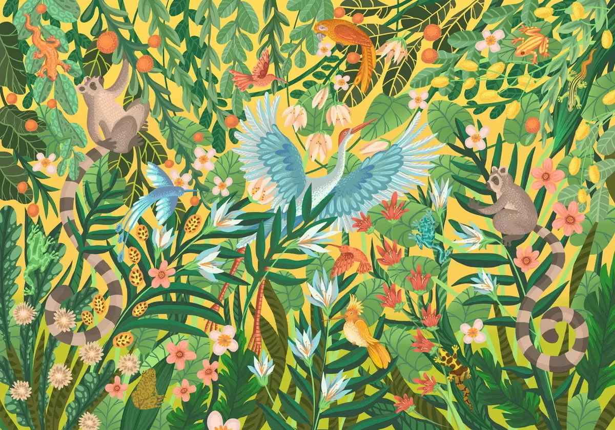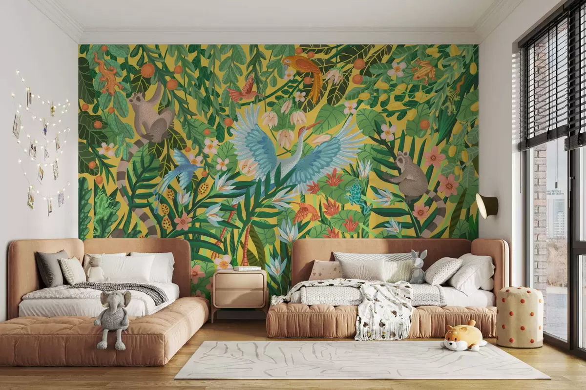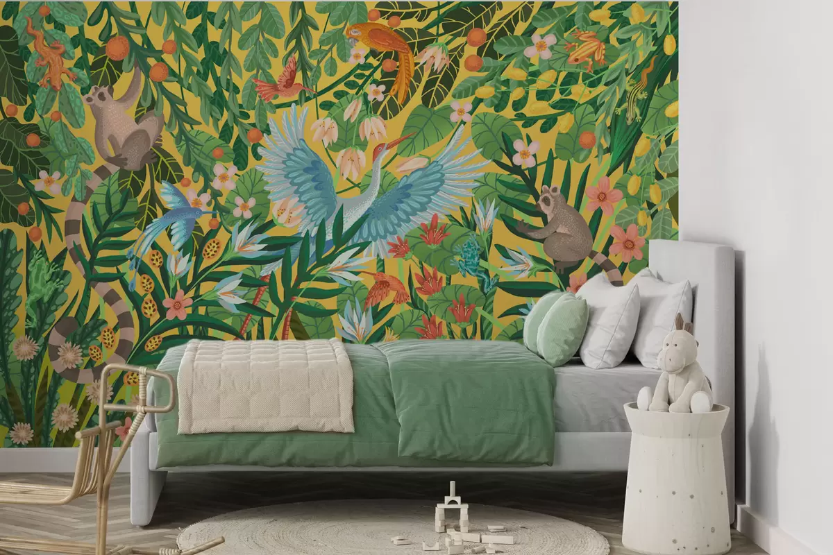 Τοιχογραφίες Φωτεινή σκηνή με πουλιά και ζώα σε πυκνή βλάστηση Nr. w05024v1
