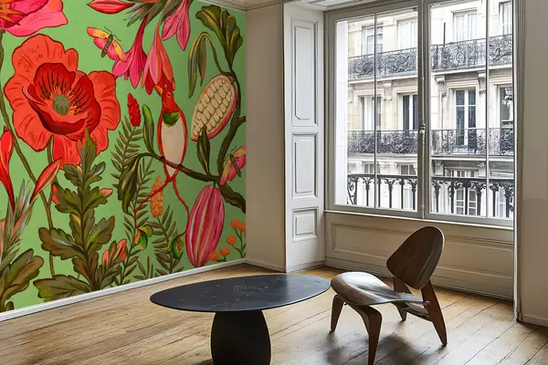 Τοιχογραφίες Διακοσμητικά λουλούδια και πουλιά σε πράσινο φόντο Nr. w05036v1