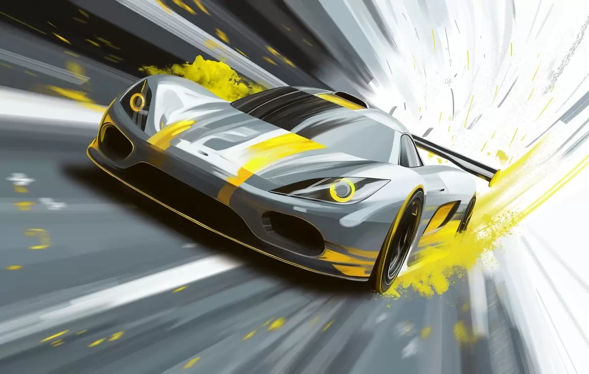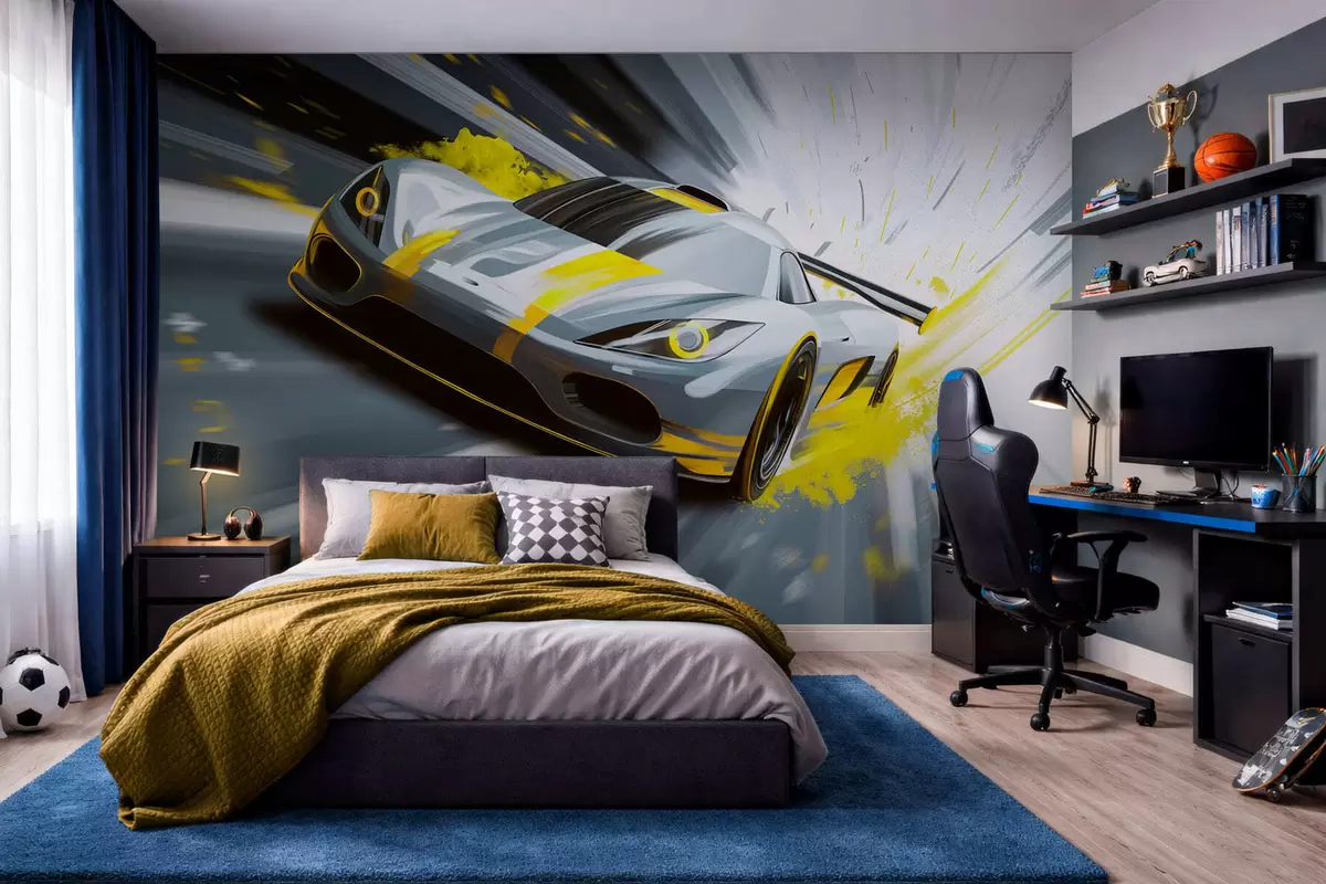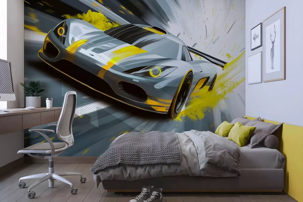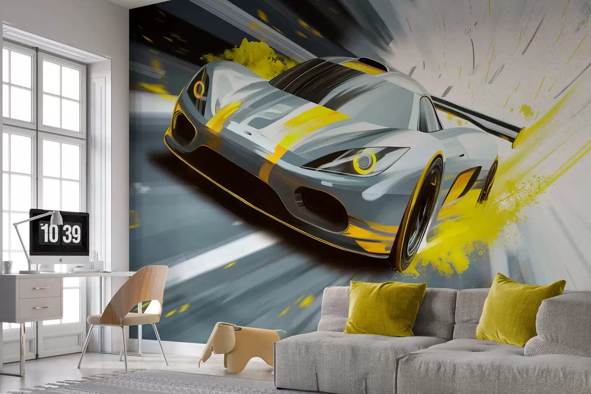 Τοιχογραφίες δυναμικό σπορ αυτοκίνητο σε ψηφιακό στυλ σχεδίασης με κίτρινες πινελιές Nr. w05069v2