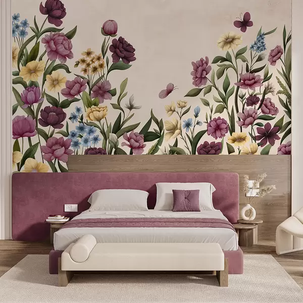 Τοιχογραφίες Λουλουδάτη σύνθεση με φυτά και πεταλούδες σε ανοιχτόχρωμο φόντο Nr. w05072
